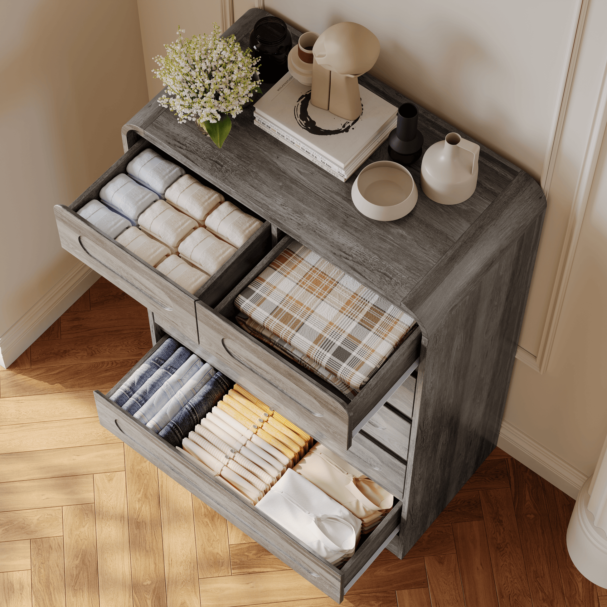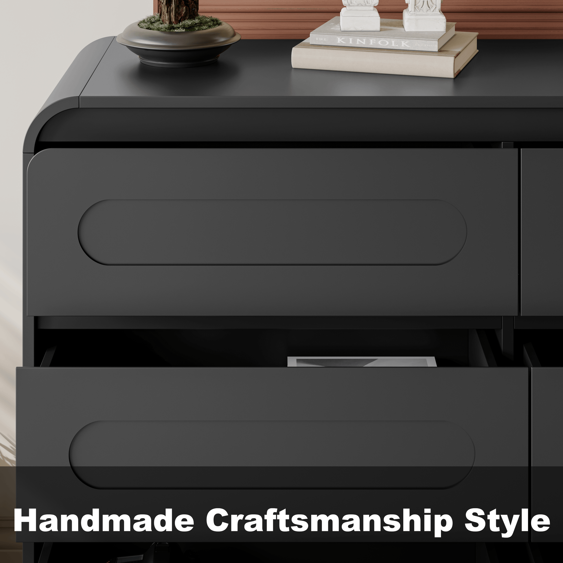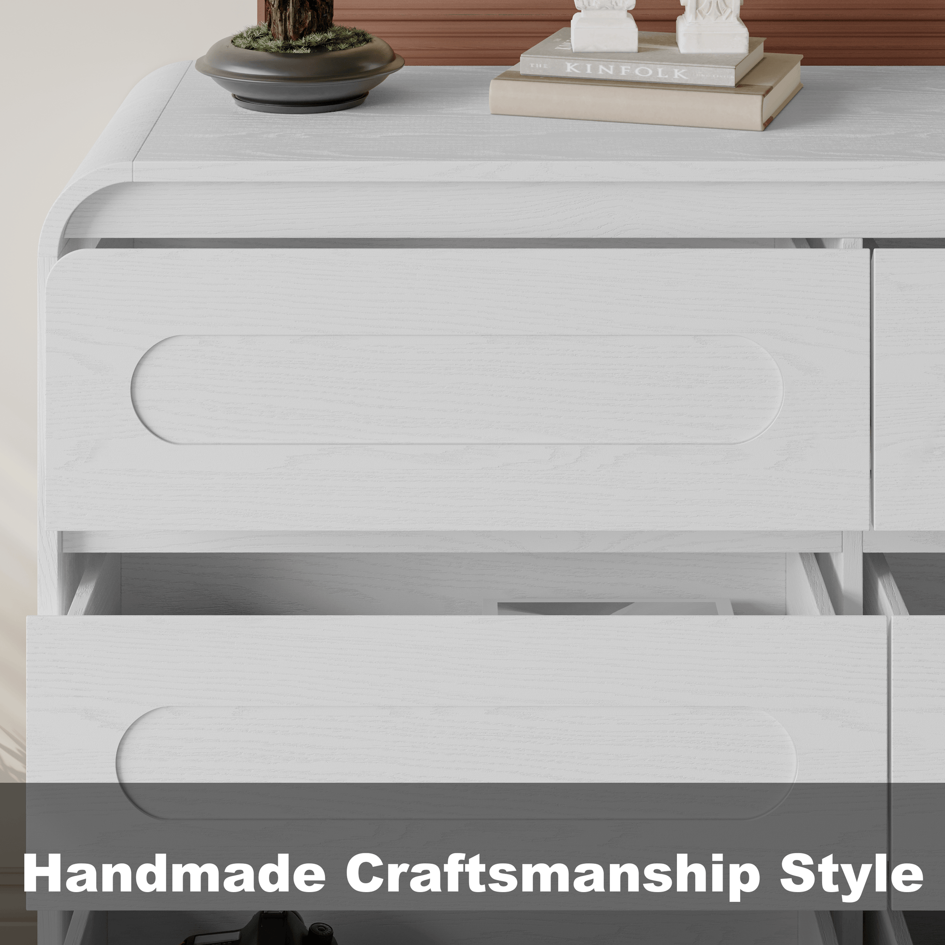 - Handcrafted Design: Enhance your space with this modern dresser, showcasing handcrafted curved patchwork drawer fronts and a smooth wood finish for a modern yet rustic appeal. The dresser adds a bold, high-end touch, blending effortlessly with modern, contemporary, or traditional decor