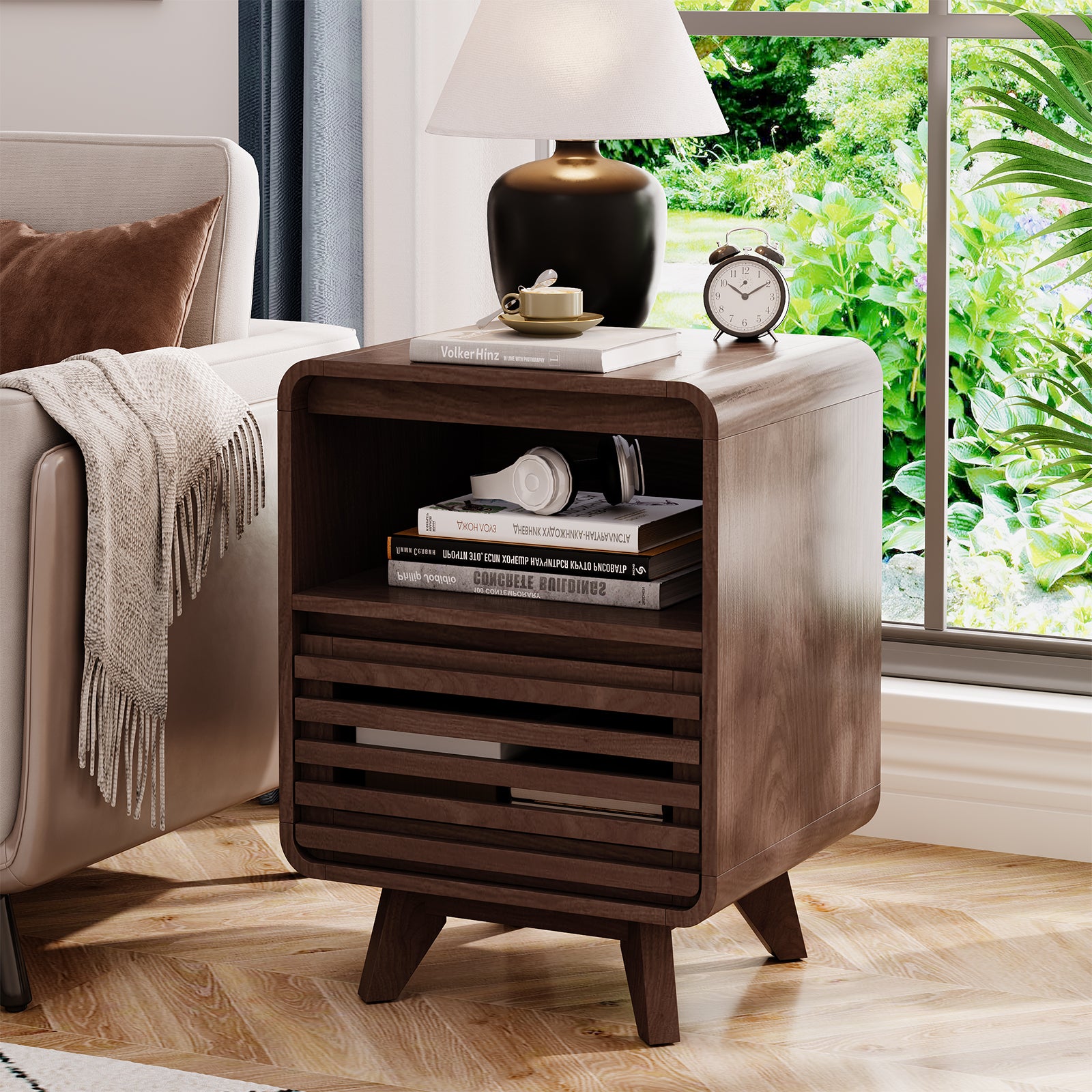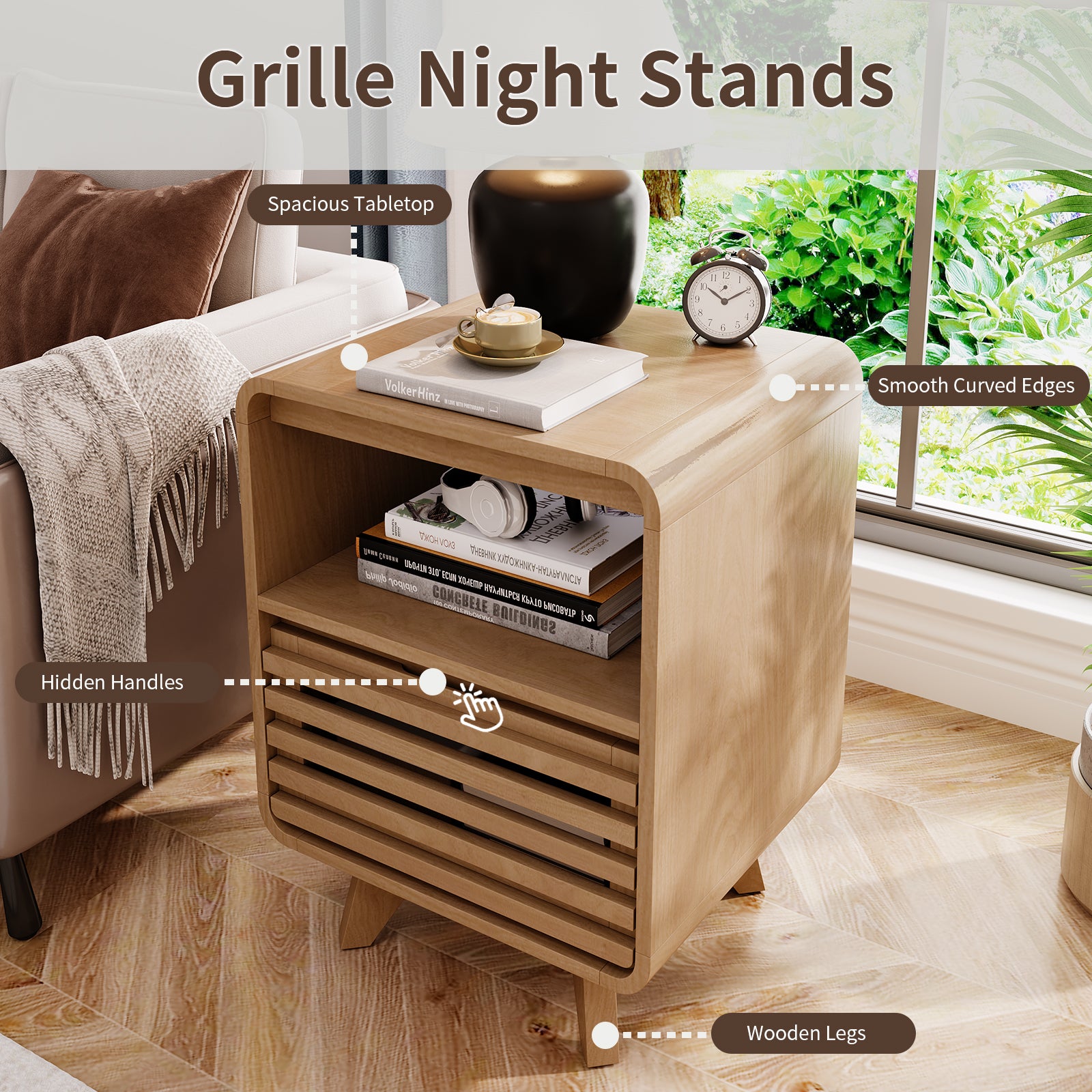 - Grille Profile: Experience refined modern elegance with smooth rounded corners on this mid-century modern end table. Seamlessly integrated concealed handles create uninterrupted clean lines, offering a minimalist, high-end look and easy access for your bedside table – perfect for any bedroom layout